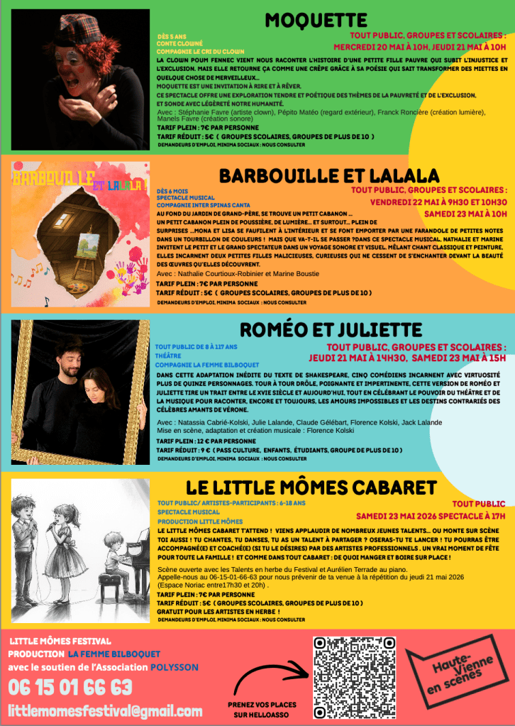 Le Festival Little Mômes et Plus de mai, spécialement dédié aux jeunes, du tout-petit au grand enfant, revient à l’Espace Noriac à Limoges pour sa version printanière du 20 au 23 mai 2026. Une programmation riche et variée mêlant toute sorte de spectacles : théâtre musical, grand classique, clown, et l’incontournable Little mômes Cabaret en clôture ! Un rendez-vous joyeux et accessible pour éveiller la curiosité, l’imaginaire et le plaisir du spectacle des plus jeunes aux plus grands !