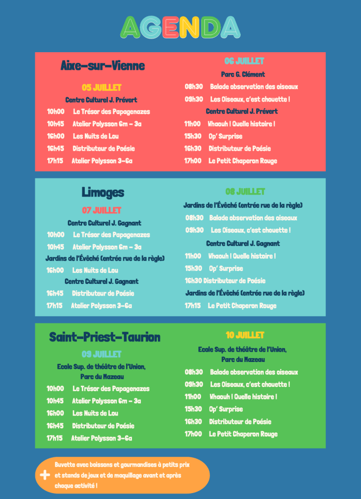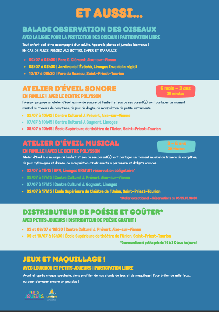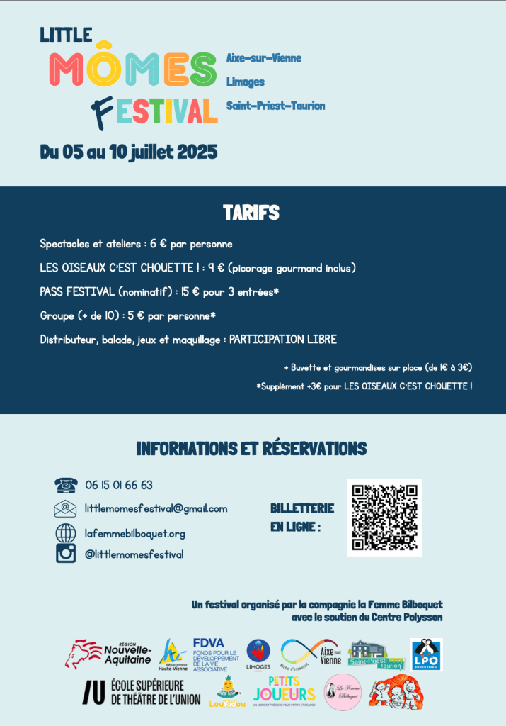 Voici la version estivale du LITTLE MÔMES FESTIVAL pour le plus grand plaisir des petits et des plus grands. Au programme, des représentations de spectacles tout public et pour tous les âges à partir de 6 mois. Au programme également, ateliers, balade découverte des oiseaux, petit-déjeuner théâtral en plein air, théâtre de foire, jeux, maquillage …